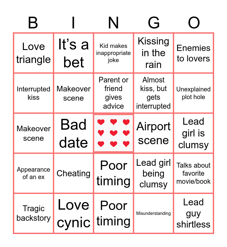 This bingo card has a free space and 56 words: Trouble saying I Love You, Tragic backstory, quirky or gay BFF, Love triangle, Poor timing, Meet-cute!, Makeover scene, Physical Comedy, Almost kiss, but gets interrupted, calling off a wedding/engagement, Kissing in the rain, Montage, Singing in public to profess love, Dance scene, It's a bet, Appearance of an ex, Enemies to lovers, Bad date, Miss-communication or misunderstanding that causes drama/fight, Lead guy shirtless, Airport scene, breakup wine or ice cream session in PJ's, Lead girl being clumsy, Kid makes inappropriate joke, "Your'e not like other girls", Parent or friend gives advice, One of the leads is rich, Love at first sight (in awe stare), Unexplained plot hole, Accidentally fall on each other, A lie is revealed, Running after the other, Slow motion kiss!, Secondary characters get together, Lead girl is clumsy, Interrupted kiss, Makeover scene, Meet-cute, Appearance of an ex, It’s a bet, Poor timing, Airport scene, Shirtless guy, Enemies to lovers, Tragic backstory, Cheating, Love cynic, They work together, Workaholic, Moment on a bridge, Misunderstanding, Kissing in the rain, “I see how you two look at each other”, Overhead shot of city, Talks about favorite movie/book and Misses/ignores a phone call.