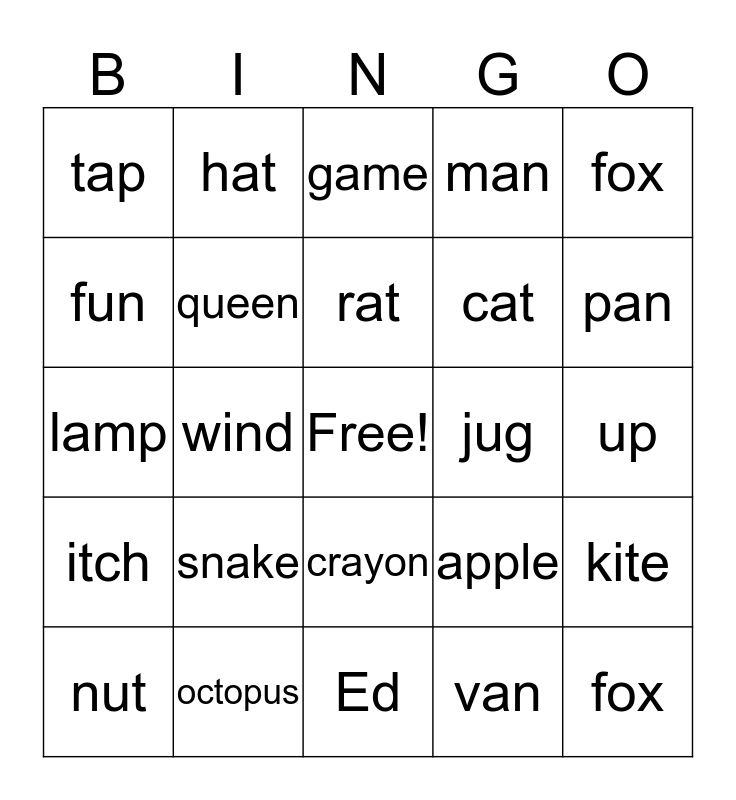 This bingo card has a free space and 27 words: apple, bat, cat, Ed, fun, game, hat, itch, jug, kite, lamp, man, nut, octopus, pan, rat, queen, rat, snake, tap, up, van, wind, fox, crayon, fox and zebra.