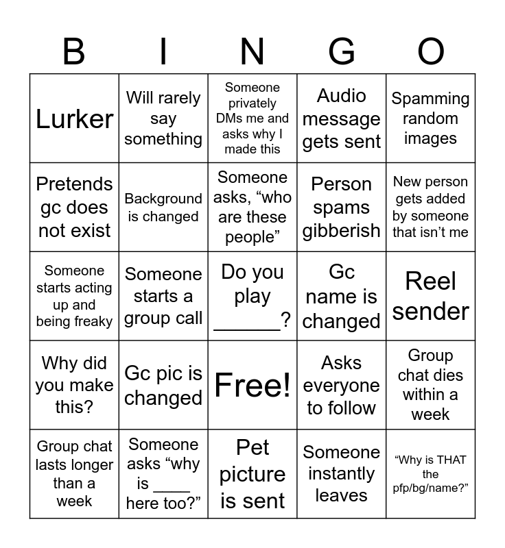 This bingo card has 26 words: Free!, Someone instantly leaves, Someone asks, “who are these people”, Someone asks “why is ____ here too?”, Spamming random images, Lurker, Pretends gc does not exist, Will rarely say something, Reel sender, Asks everyone to follow, Person spams gibberish, Someone starts acting up and being freaky, Group chat dies within a week, Group chat lasts longer than a week, Someone starts a group call, Texting in a foreign language, Audio message gets sent, Why did you make this?, Someone privately DMs me and asks why I made this, Do you play ______?, New person gets added by someone that isn’t me, Pet picture is sent, Gc name is changed, Gc pic is changed, Background is changed and “Why is THAT the pfp/bg/name?”.