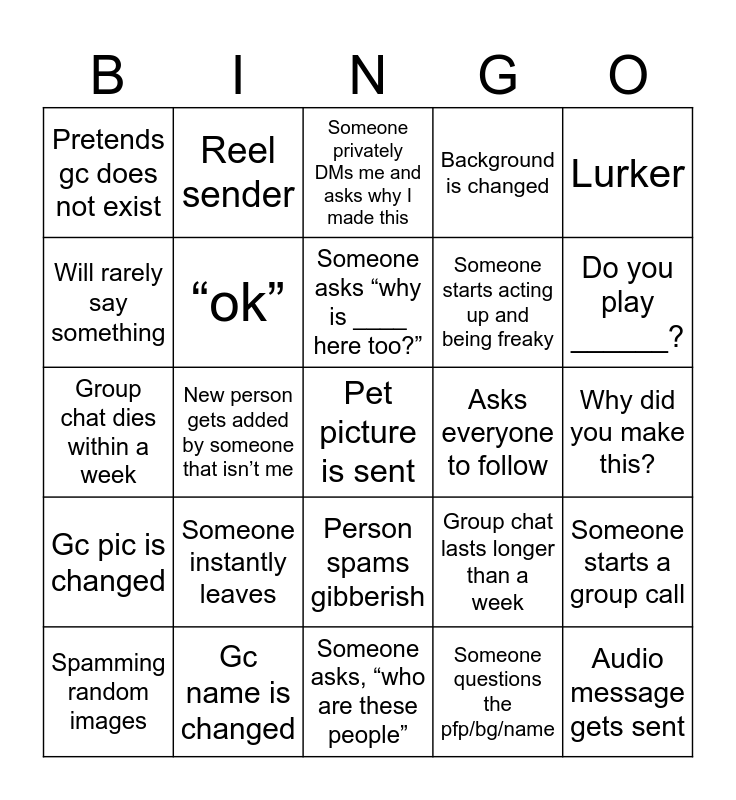 This bingo card has 25 words: Someone instantly leaves, Someone asks, “who are these people”, Someone asks “why is ____ here too?”, Spamming random images, Lurker, Pretends gc does not exist, Will rarely say something, Reel sender, Asks everyone to follow, Person spams gibberish, Someone starts acting up and being freaky, Group chat dies within a week, Group chat lasts longer than a week, Someone starts a group call, “ok”, Audio message gets sent, Why did you make this?, Someone privately DMs me and asks why I made this, Do you play ______?, New person gets added by someone that isn’t me, Pet picture is sent, Gc name is changed, Gc pic is changed, Background is changed and Someone questions the pfp/bg/name.