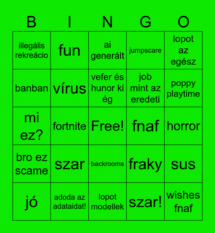 This bingo card has a free space and 25 words: szar, lopot modellek, vefer és hunor ki ég, jó, lopot az egész, illegális rekreácio, banban, fun, fnaf, backrooms, job mint az eredeti, mi ez?, fraky, sus, vírus, ijesztő, horror, ai generált, poppy playtime, fortnite, wishes fnaf, adoda az adataidat!, bro ez scame, jumpscare and szar!.