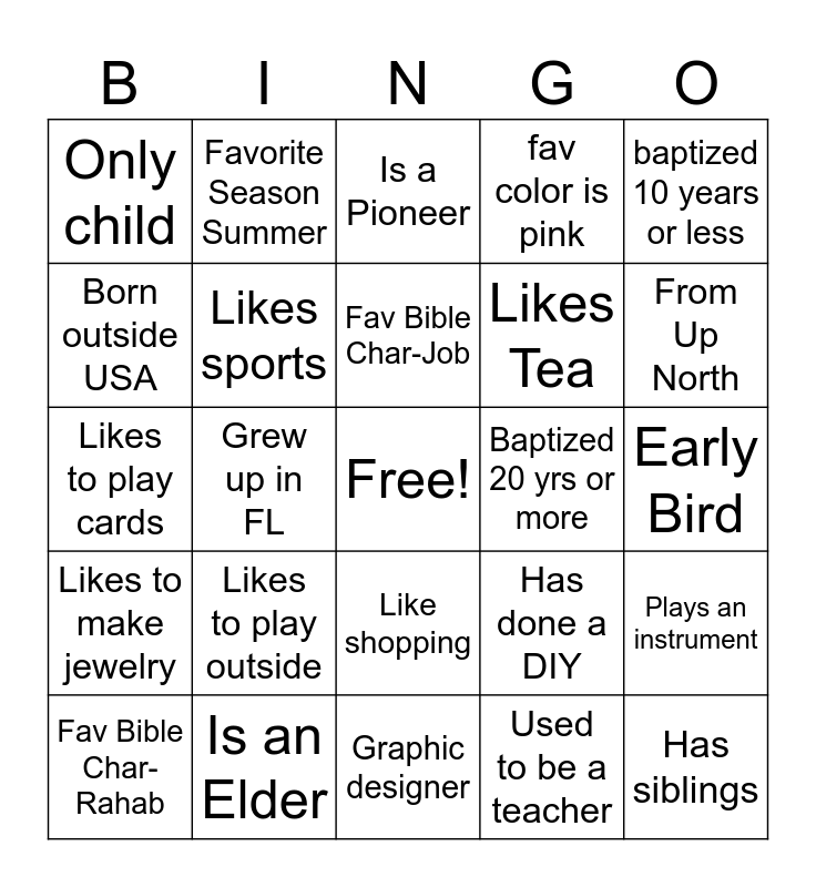 This bingo card has a free space and 53 words: In The Truth the Longest, Grew up in FL, Afraid of Spiders, Night Owl, Early Bird, Favorite Season Fall, Favorite Season Summer, Grew Up in Truth, Likes Tea, Likes Coffee, Likes to play cards, Been to Bethel, Used to be a teacher, Plays an instrument, Been to Int Conv., Is an Elder, Is a Pioneer, Has done a DIY, Speaks another language, Born outside USA, Likes sports, Graphic designer, Baptized 20 yrs or more, baptized 10 years or less, Likes animals, Likes to draw, Like shopping, Introvert, Extrovert, Likes to make jewelry, Likes crafting, Likes to take pics, has a sweet tooth, Works in healthcare, fav color is green, Fav color is blue, fav color is pink, Has siblings, Only child, Parents in the Truth, Found Truth Door to Door, Been to Spec. Conv, From Up North, From the South, From an island, Fav Bible Char-Job, Fav Bible Char Peter, Fav Bible Char- Paul, Fav Bible Char-Rahab, Likes to play outside, Likes to smoke meat, Unbaptized Publisher and Does Metro.