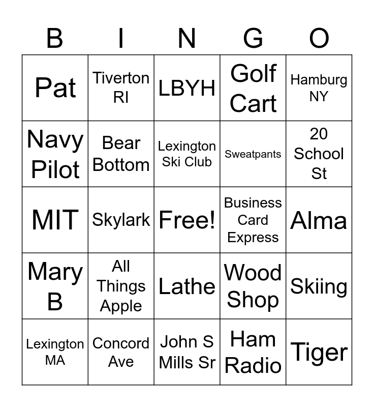 This bingo card has a free space and 33 words: Princeton, Rhapsody, Skylark, Barbara E, Mary B, Bear Bottom, Hamburg NY, Lexington MA, Tiverton RI, Loon Mtn, Lexington Ski Club, LBYH, Hobie Cat, Jamestown Distributors, Business Card Express, 20 School St, Concord Ave, MIT, All Things Apple, Wood Shop, Lathe, Suzy, Pat, Alma, John S Mills Sr, Tiger, Golf Cart, Sweatpants, Navy Pilot, Skiing, Sailing, Ham Radio and Naps.