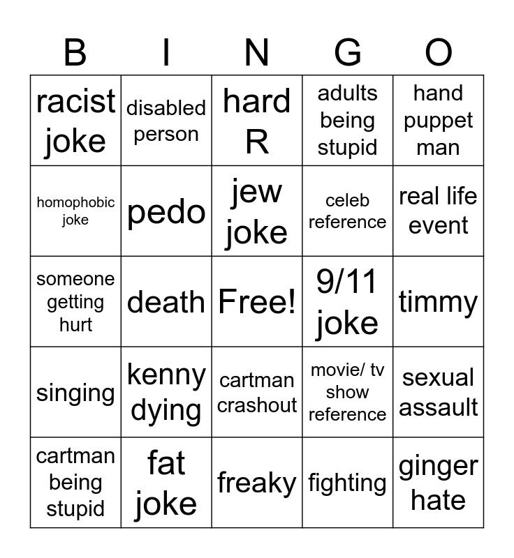 This bingo card has a free space and 24 words: kenny dying, fat joke, jew joke, cartman being stupid, hand puppet man, racist joke, homophobic joke, disabled person, 9/11 joke, cartman crashout, celeb reference, someone getting hurt, movie/ tv show reference, sexual assault, pedo, fighting, timmy, hard R, real life event, death, ginger hate, singing, adults being stupid and freaky.