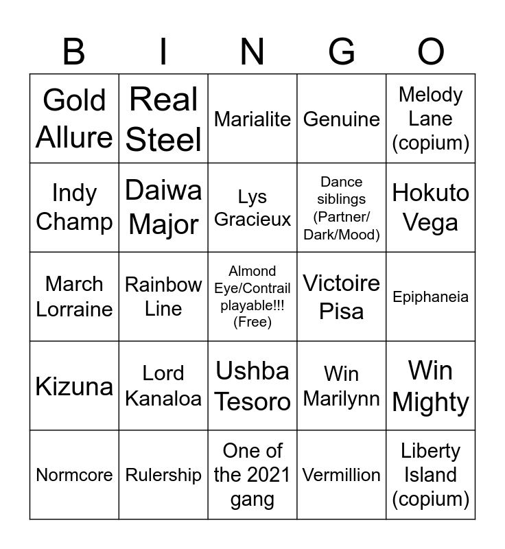 This bingo card has a free space and 24 words: Lord Kanaloa, Rulership, Lys Gracieux, Normcore, Melody Lane (copium), Gold Allure, Indy Champ, Real Steel, Victoire Pisa, Ushba Tesoro, Dance siblings (Partner/ Dark/Mood), March Lorraine, Win Marilynn, Win Mighty, Daiwa Major, Vermillion, Epiphaneia, Marialite, Hokuto Vega, Rainbow Line, Liberty Island (copium), Kizuna, Genuine and One of the 2021 gang.
