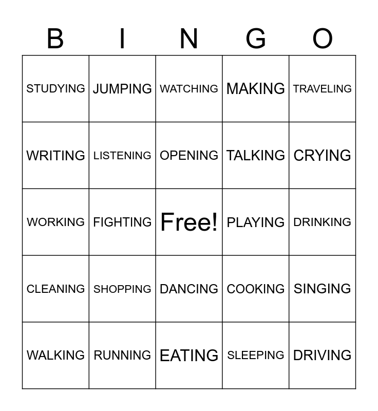 This bingo card has a free space and 30 words: RUNNING, SWIMMING, FIGHTING, TEXTING, STUDYING, WATCHING, LISTENING, DANCING, PLAYING, EATING, DRINKING, DRIVING, SLEEPING, LAUGHING, CRYING, DRAWING, COOKING, CLEANING, SHOPPING, TRAVELING, WORKING, READING, JUMPING, TALKING, WRITING, MAKING, SINGING, WALKING, OPENING and CLOSING.