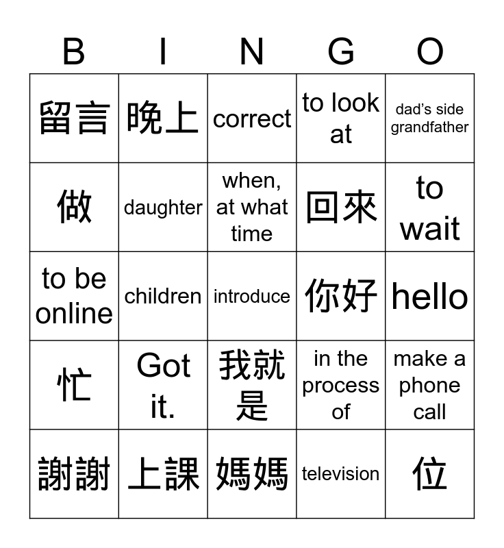 This bingo card has 25 words: Got it., 媽媽, when, at what time, 謝謝, dad’s side grandfather, 留言, 做, 晚上, 你好, 我就是, 回來, to be online, in the process of, make a phone call, daughter, 位, hello, correct, to wait, children, introduce, 上課, 忙, to look at and television.
