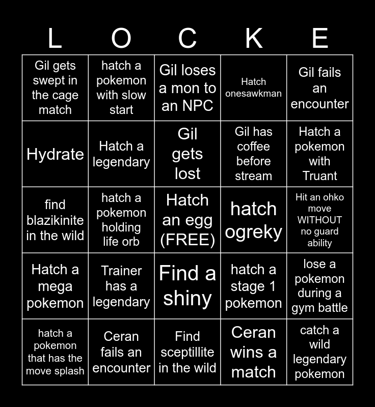 This bingo card has a free space and 45 words: hatch egg 69, catch a wild legendary pokemon, die by explosion, hatch a pokemon that has the move splash, Gil wins a match, Ceran wins a match, Gil loses a mon to an NPC, Ceran loses a mon to an NPC, Gil fails an encounter, Ceran fails an encounter, Hatch onesawkman, hatch ogreky, Find a shiny, Trainer has a legendary, Find Sacred Ash in the wild, Find sceptillite in the wild, find swampertite in the wild, find blazikinite in the wild, Find a pokemon/trainer with shadow tag, Hatch a pokemon with Truant, hatch a pokemon with slow start, Hatch a mon with celebrate, catch a form pokemon / this is megas and form change mons like rotom, Gil gets swept in the cage match, Ceran gets swept in the match, Hit an ohko move WITHOUT no guard ability, Hatch a shiny pokemon, hatch a pokemon with the move metronome, hatch a stage 1 pokemon, Hatch a mega pokemon, Lose a pokemon to a rival fight, lose a pokemon during a gym battle, Find an enigma berry in the wild, hatch a bulbasaur/bulbasaur line, hatch a duskull/duskull line, hatch a pokemon holding life orb, hatch a pokemon holding a choice item, Pee break, Stream is scuffed, Gil gets lost, Hydrate, Gil has coffee before stream, Lose a mon to Maxie/Archie, Hatch a legendary and Both streams hit 10 likes.