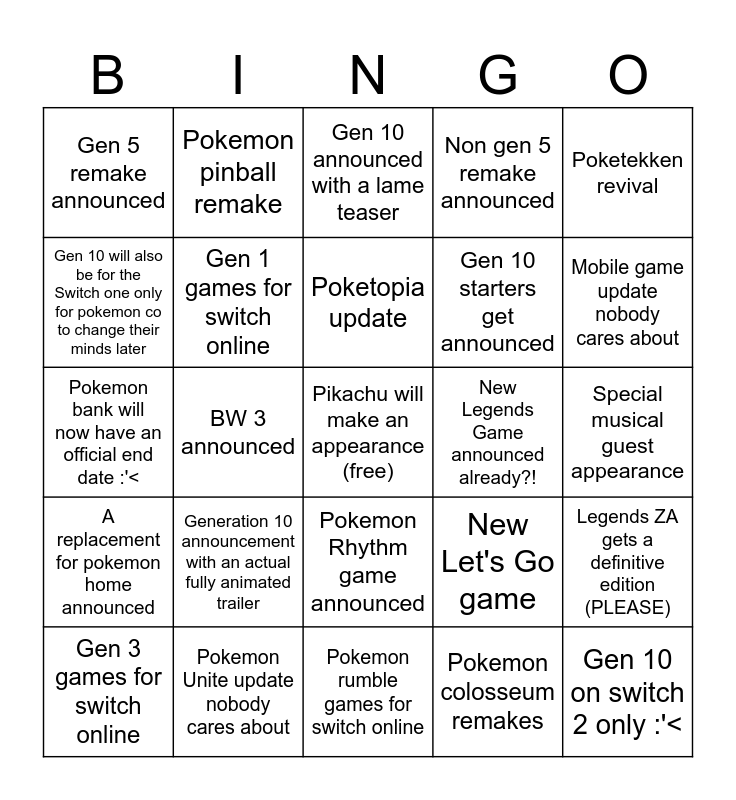 This bingo card has a free space and 24 words: Generation 10 announcement with an actual fully animated trailer, Pokemon Unite update nobody cares about, Poketopia update, Gen 3 games for switch online, Poketekken revival, Gen 5 remake announced, Gen 10 will also be for the Switch one only for pokemon co to change their minds later, Pokemon pinball remake, New Legends Game announced already?!, Pokemon Rhythm game announced, Gen 10 starters get announced, Pokemon bank will now have an official end date :'<, New Let's Go game, Legends ZA gets a definitive edition (PLEASE), Gen 1 games for switch online, Pokemon colosseum remakes, Special musical guest appearance, Gen 10 announced with a lame teaser, Mobile game update nobody cares about, BW 3 announced, Gen 10 on switch 2 only :'<, A replacement for pokemon home announced, Non gen 5 remake announced and Pokemon rumble games for switch online.