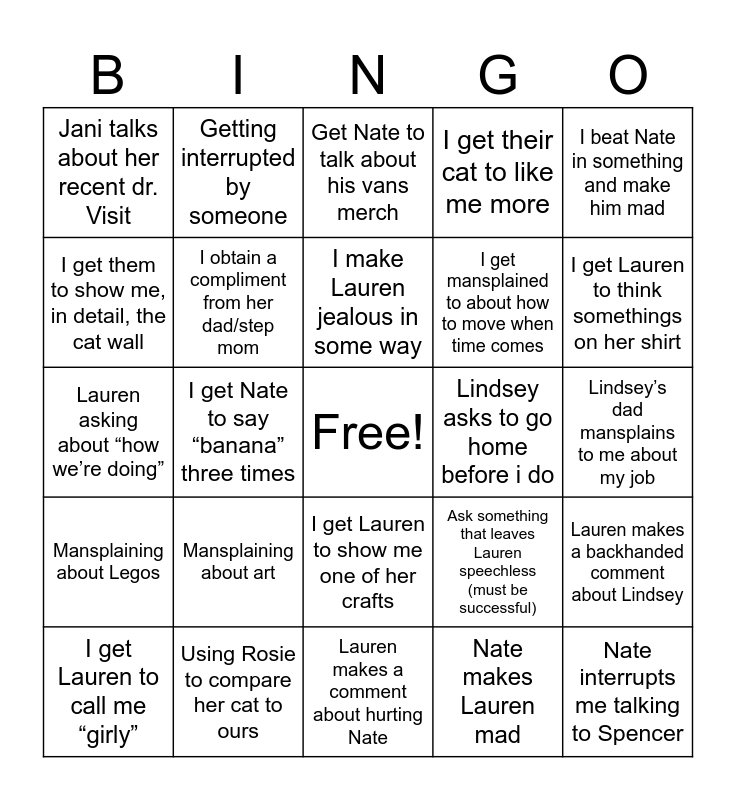 This bingo card has a free space and 24 words: Mansplaining about art, Using Rosie to compare her cat to ours, I make Lauren jealous in some way, I get Lauren to call me “girly”, I beat Nate in something and make him mad, Jani talks about her recent dr. Visit, I get them to show me, in detail, the cat wall, Getting interrupted by someone, Lindsey asks to go home before i do, I get Lauren to show me one of her crafts, I get mansplained to about how to move when time comes, Lauren asking about “how we’re doing”, Ask something that leaves Lauren speechless (must be successful), Lauren makes a backhanded comment about Lindsey, I obtain a compliment from her dad/step mom, Nate makes Lauren mad, Lindsey’s dad mansplains to me about my job, Get Nate to talk about his vans merch, I get Lauren to think somethings on her shirt, I get Nate to say “banana” three times, Nate interrupts me talking to Spencer, Mansplaining about Legos, I get their cat to like me more and Lauren makes a comment about hurting Nate.