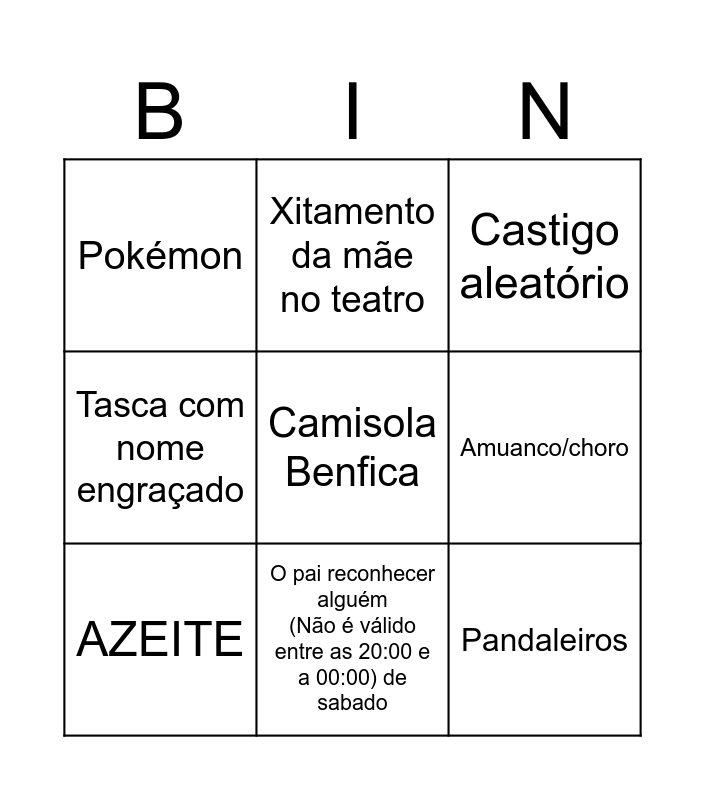 This bingo card has a free space and 8 words: Amuanco/choro, Castigo aleatório, Xitamento da mãe no teatro, AZEITE, Pokémon, Pandaleiros, Tasca com nome engraçado and O pai reconhecer alguém (Não é válido entre as 20:00 e a 00:00) de sabado.