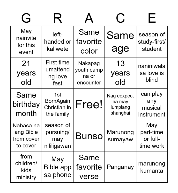 This bingo card has a free space and 24 words: season of pursuing/ may nililigawan, May Bible app sa phone, Nakapag youth camp na or encounter, from children/ kids ministry, season of study-first/ student, May nainvite for this event, 21 years old, left-handed or kaliwete, Nag eexpect na may lumpiang shanghai, Bunso, 13 years old, Same birthday month, Marunong sumayaw, May part-time or full-time work, First time umattend ng love fest, Panganay, can play any musical instrument, Same favorite color, naniniwala sa love is blind, 1st BornAgain Christian in the family, marunong kumanta, Nabasa na ang Bible from cover to cover, Same age and Same favorite verse.