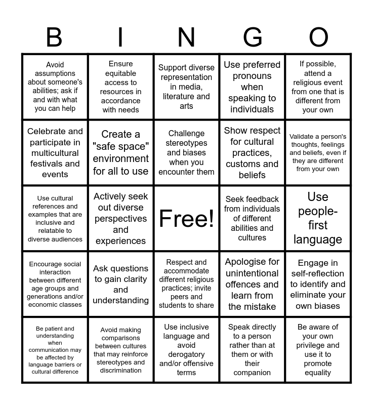 This bingo card has a free space and 24 words: Ask questions to gain clarity and understanding, Avoid making comparisons between cultures that may reinforce stereotypes and discrimination, Challenge stereotypes and biases when you encounter them, Be patient and understanding when communication may be affected by language barriers or cultural difference, If possible, attend a religious event from one that is different from your own, Avoid assumptions about someone's abilities; ask if and with what you can help, Celebrate and participate in multicultural festivals and events, Ensure equitable access to resources in accordance with needs, Seek feedback from individuals of different abilities and cultures, Respect and accommodate different religious practices; invite peers and students to share, Show respect for cultural practices, customs and beliefs, Use cultural references and examples that are inclusive and relatable to diverse audiences, Apologise for unintentional offences and learn from the mistake, Engage in self-reflection to identify and eliminate your own biases, Create a "safe space" environment for all to use, Speak directly to a person rather than at them or with their companion, Use people-first language, Support diverse representation in media, literature and arts, Validate a person's thoughts, feelings and beliefs, even if they are different from your own, Actively seek out diverse perspectives and experiences, Be aware of your own privilege and use it to promote equality, Encourage social interaction between different age groups and generations and/or economic classes, Use preferred pronouns when speaking to individuals and Use inclusive language and avoid derogatory and/or offensive terms.