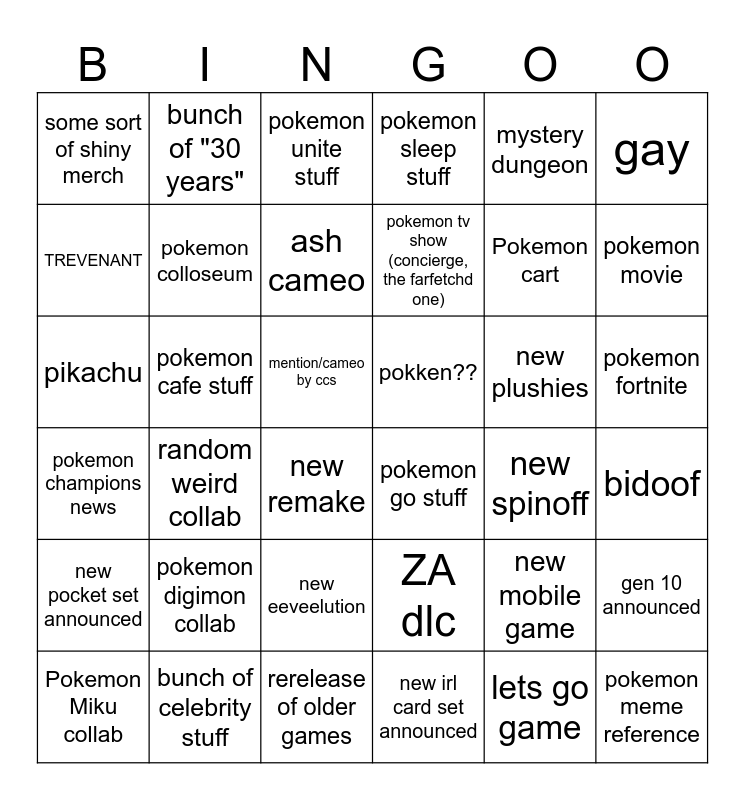 This bingo card has 36 words: ZA dlc, new eeveelution, new irl card set announced, TREVENANT, pokemon champions news, pokken??, pokemon colloseum, rerelease of older games, mystery dungeon, new mobile game, pokemon movie, pokemon sleep stuff, gen 10 announced, pokemon cafe stuff, pokemon tv show (concierge, the farfetchd one), some sort of shiny merch, new pocket set announced, new plushies, pikachu, pokemon unite stuff, mention/cameo by ccs, random weird collab, pokemon go stuff, new remake, new spinoff, bunch of "30 years", Pokemon cart, bunch of celebrity stuff, ash cameo, gay, pokemon meme reference, Pokemon Miku collab, bidoof, pokemon fortnite, pokemon digimon collab and lets go game.