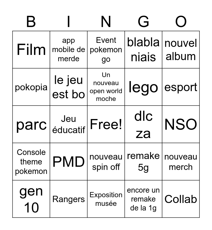 This bingo card has a free space and 24 words: PMD, Rangers, Un nouveau open world moche, gen 10, nouvel album, Film, pokopia, app mobile de merde, dlc za, nouveau spin off, lego, parc, remake 5g, nouveau merch, le jeu est bo, encore un remake de la 1g, NSO, Event pokemon go, esport, Jeu éducatif, Collab, Console theme pokemon, blabla niais and Exposition musée.