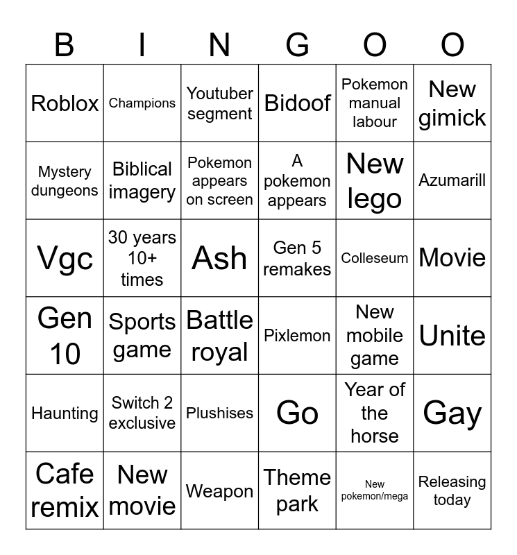 This bingo card has 36 words: Go, Plushises, Theme park, Mystery dungeons, Gen 10, Gen 5 remakes, Biblical imagery, Weapon, Pokemon manual labour, Year of the horse, Azumarill, Bidoof, Gay, 30 years 10+ times, A pokemon appears, Roblox, Haunting, Colleseum, Vgc, Youtuber segment, Ash, Sports game, Pixlemon, Battle royal, New mobile game, Champions, New lego, New movie, Pokemon appears on screen, New gimick, Releasing today, Cafe remix, Unite, Movie, Switch 2 exclusive and New pokemon/mega.