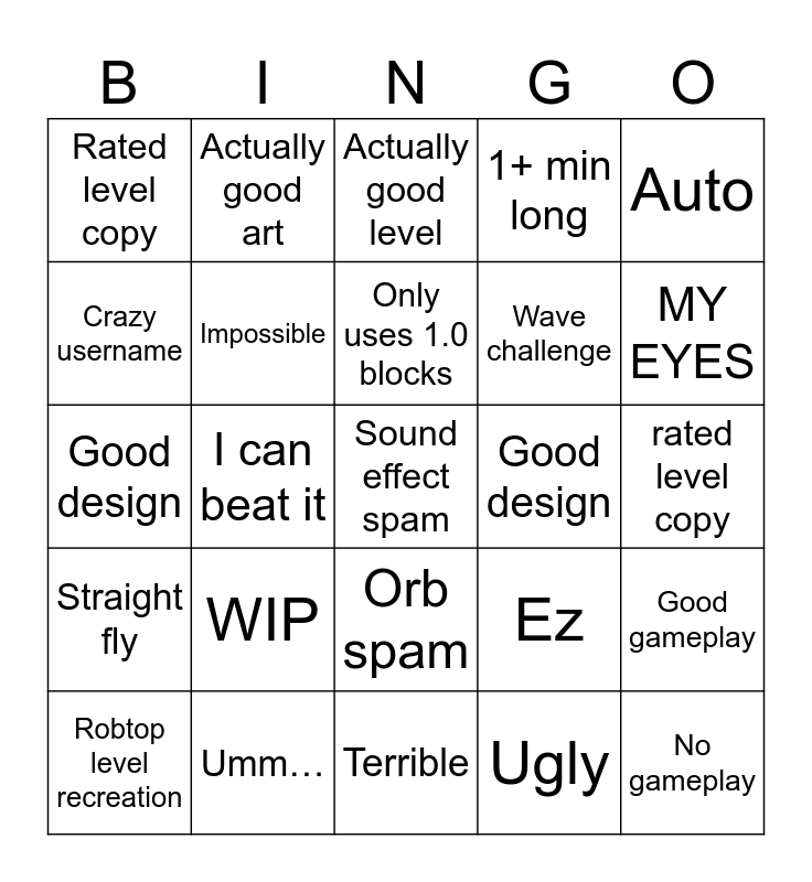 This bingo card has 25 words: WIP, Terrible, Only uses 1.0 blocks, Robtop level recreation, Auto, Rated level copy, Crazy username, Actually good art, Good design, Orb spam, Wave challenge, Good design, Ez, Good gameplay, Impossible, No gameplay, rated level copy, Actually good level, MY EYES, I can beat it, Sound effect spam, Umm…, Straight fly, 1+ min long and Ugly.