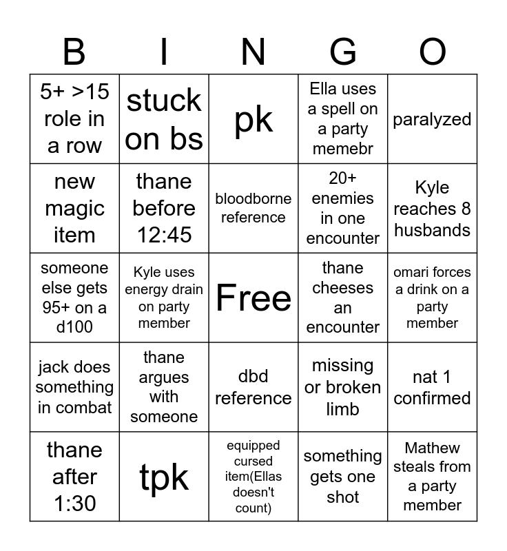 This bingo card has a free space and 39 words: death, 20, 1, thane before 12:45, thane after 1:30, dbd reference, bloodborne reference, unconscious, paralyzed, jack does something in combat, Kyle uses energy drain on party member, Ella uses a spell on a party memebr, Mathew steals from a party member, omari forces a drink on a party member, thane cheeses an encounter, thane argues with someone, seduction (not Kyle), 5+ >15 role in a row, 5+ >5 role in a row, missing or broken limb, new magic item, equipped cursed item(Ellas doesn't count), 20+ enemies in one encounter, Kyle reaches 8 husbands, someone gets cursed, meet a god, Critical role referenced, decapitation, side quest #4, stuck on bs, classic door problem, fights a non-hostile npc, pk, tpk, something gets one shot, nat 20 not confirmed, nat 1 confirmed, someone else gets 95+ on a d100 and underwater encounter.