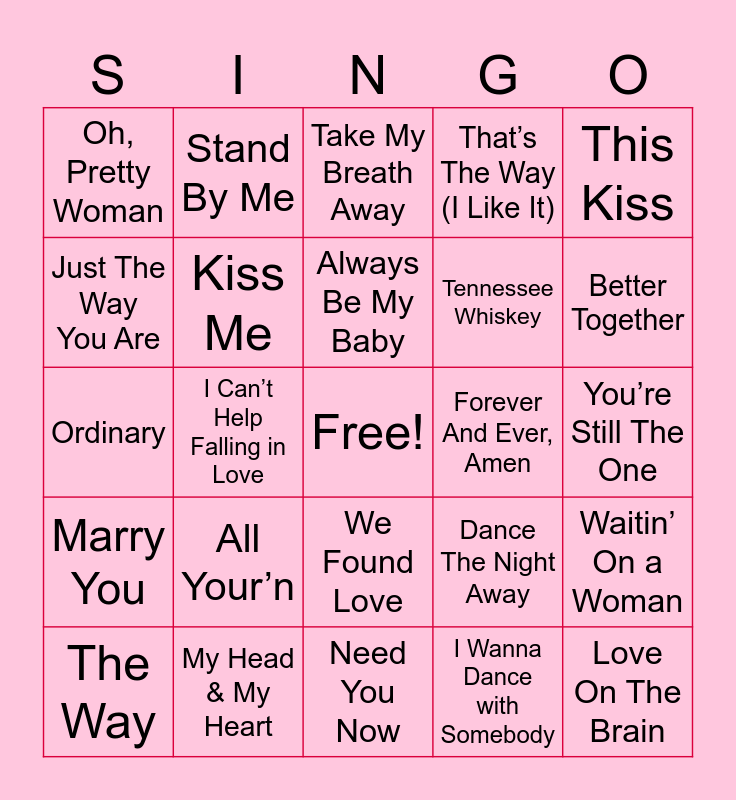 This bingo card has a free space and 84 words: A Thousand Years, Lover, Take My Breath Away, One Call Away, Love Me Like You Do, Time After Time, Crazy Little Thing Called Love, Yellow, Adore You, I’m Yours, Forever After All, What Makes You Beautiful, Kiss Me, Forever And Ever, Amen, Brown Eyed Girl, Oh, Pretty Woman, The Way, Just The Way You Are, (I’ve Had) The Time Of My Life, Everywhere, Love Story, Tennessee Whiskey, Love On The Brain, The Kind of Love We Make, I Can’t Help Falling in Love, Your Song, I Will Always Love You, Perfect, All of Me, You Belong With Me, All Your’n, Thinking Out Loud, I Want It That Way, Ordinary, The Only Exception, Carrying Your Love With Me, Need You Now, You Look Like You Love Me, Better Together, Marry You, Sweet Child O’ Mine, Beautiful Crazy, Chasin’ You, Mine, 7 Summers, How Sweet It Is (To Be Loved By You), Stand By Me, Purple Rain, Don’t Stop, Locked Out of Heaven, Love Shack, Dance The Night Away, That’s The Way (I Like It), Take On Me, Believe, Meant to Be, My Head & My Heart, Always Be My Baby, The One, You’re Still The One, Die a Happy Man, Tennessee Orange, Your Man, Lovin’ You is Fun, Cowboy Take Me Away, Like The Rain, Enchanted, No One Else On Earth, This Kiss, Something In The Orange, Waitin’ On a Woman, Someone Like You, Crazy in Love, Birds of a Feather, We Found Love, I Wanna Dance with Somebody, Wannabe, Flowers, Call Me Maybe, Mirrors, Teenage Dream, Bad Romance, Stay and My Heart Will Go On.