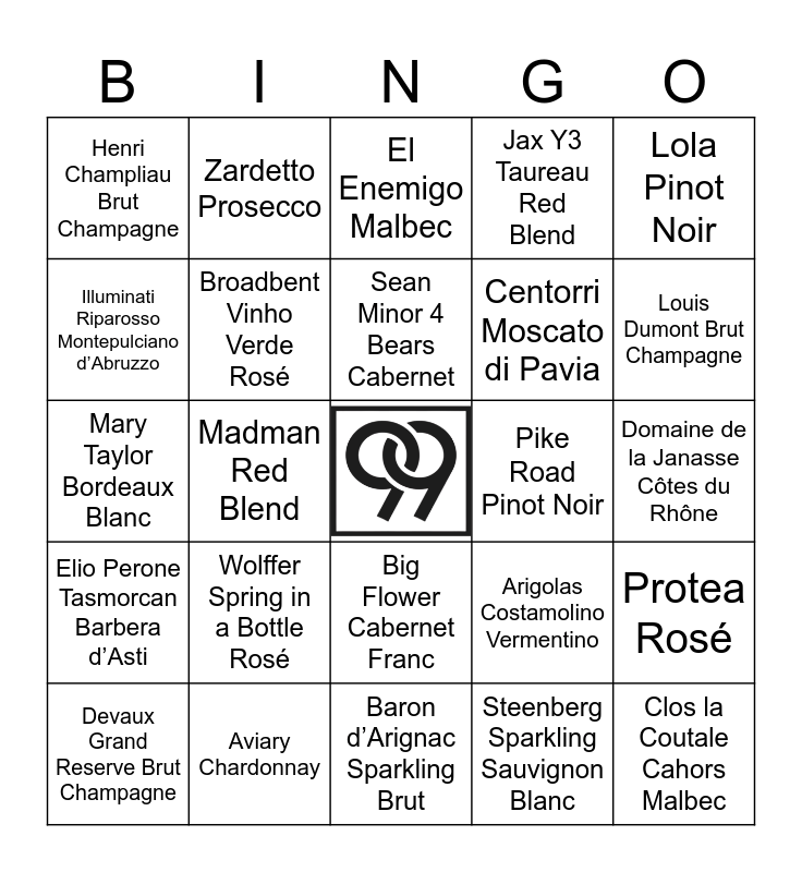 This bingo card has a free space and 37 words: Slo Down Send Nudes Rosé, Figuiere Magali Rosé, Mont Gravet Rosé, Broadbent Vinho Verde Rosé, Protea Rosé, Wolffer Spring in a Bottle Rosé, Sean Minor 4 Bears Cabernet, Smith & Hook Cabernet, Lola Pinot Noir, Valravn Zinfandel, Madman Red Blend, Jax Y3 Taureau Red Blend, Clos la Coutale Cahors Malbec, Domaine de la Janasse Côtes du Rhône, Illuminati Riparosso Montepulciano d’Abruzzo, Elio Perone Tasmorcan Barbera d’Asti, Catena Vista Flores Malbec, El Enemigo Malbec, Big Flower Cabernet Franc, Pike Road Pinot Noir, Henri Champliau Brut Champagne, Louis Dumont Brut Champagne, Devaux Grand Reserve Brut Champagne, Baron d’Arignac Sparkling Brut, Francois Montand Brut Rosé, Steenberg Sparkling Sauvignon Blanc, Zardetto Prosecco, Adami Vigneto Giardino Prosecco, Cipriani Bellini, Zardetto Spritz, Wolffer Spring in a Bottle Blanc de Blancs, Aviary Chardonnay, Mary Taylor Bordeaux Blanc, Terre Di Rai Pinot Grigio, Arigolas Costamolino Vermentino, Centorri Moscato di Pavia and Ponga Sauvignon Blanc.