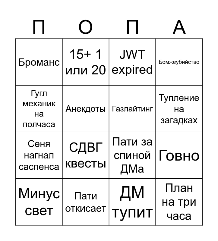 This bingo card has 16 words: Пати откисает, Говно, JWT expired, Броманс, Сеня нагнал саспенса, 15+ 1 или 20, Пати за спиной ДМа, ДМ тупит, Гугл механик на полчаса, Анекдоты, Минус свет, Бомжеубийство, СДВГ квесты, Тупление на загадках, Газлайтинг and План на три часа.