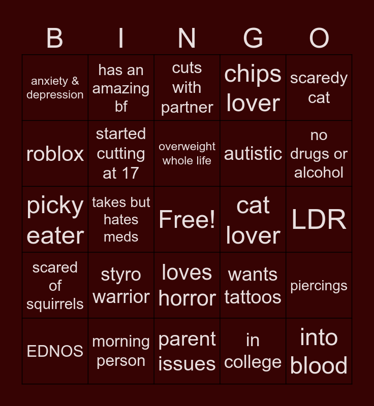 This bingo card has a free space and 24 words: styro warrior, morning person, overweight whole life, EDNOS, scaredy cat, anxiety & depression, roblox, has an amazing bf, cat lover, loves horror, autistic, picky eater, wants tattoos, piercings, started cutting at 17, in college, LDR, cuts with partner, no drugs or alcohol, takes but hates meds, into blood, scared of squirrels, chips lover and parent issues.