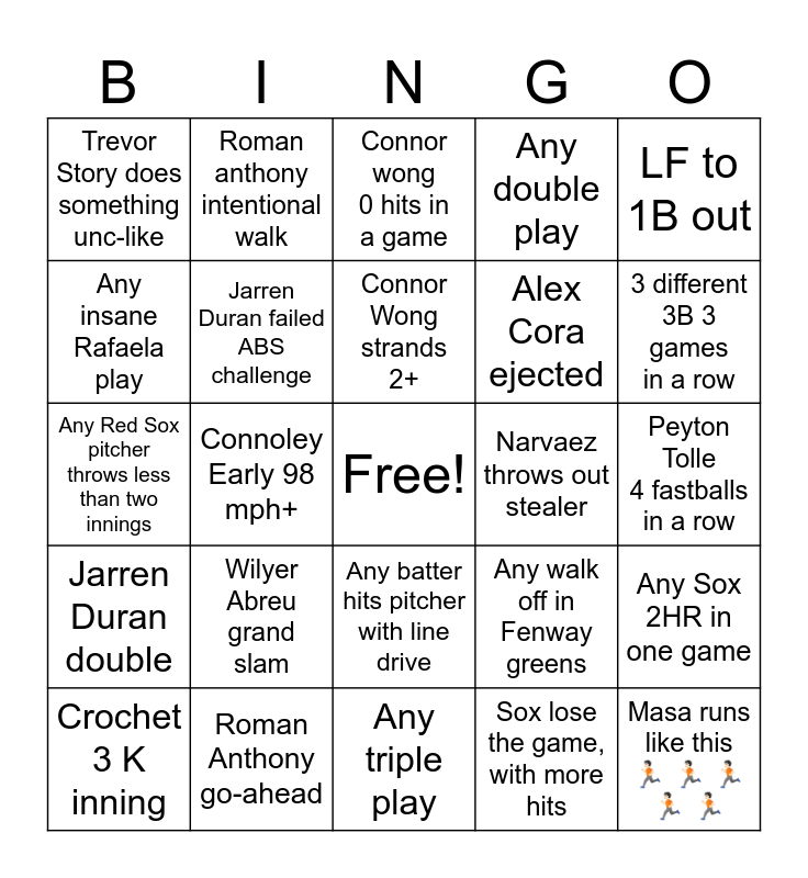 This bingo card has a free space and 24 words: Wilyer Abreu grand slam, Roman Anthony go-ahead, Connor Wong strands 2+, Crochet 3 K inning, LF to 1B out, Trevor Story does something unc-like, Any insane Rafaela play, Roman anthony intentional walk, Narvaez throws out stealer, Any batter hits pitcher with line drive, Alex Cora ejected, Any Red Sox pitcher throws less than two innings, Any walk off in Fenway greens, Any Sox 2HR in one game, Jarren Duran failed ABS challenge, Sox lose the game, with more hits, Peyton Tolle 4 fastballs in a row, Connor wong 0 hits in a game, 3 different 3B 3 games in a row, Connoley Early 98 mph+, Masa runs like this 🏃🏻 🏃🏻 🏃🏻 🏃🏻 🏃🏻, Jarren Duran double, Any double play and Any triple play.