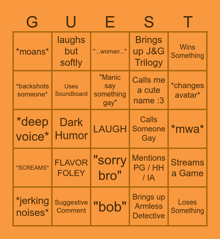 This bingo card has a free space and 24 words: *jerking noises*, FLAVOR FOLEY, "Manic say something gay", Brings up Armless Detective, Wins Something, *moans*, laughs but softly, "...woman...", Calls Someone Gay, *mwa*, *deep voice*, Uses Soundboard, Mentions PG / HH / IA, Streams a Game, *backshots someone*, Suggestive Comment, "bob", Brings up J&G Trilogy, *changes avatar*, *SCREAMS*, Dark Humor, "sorry bro", Calls me a cute name :3 and Loses Something.