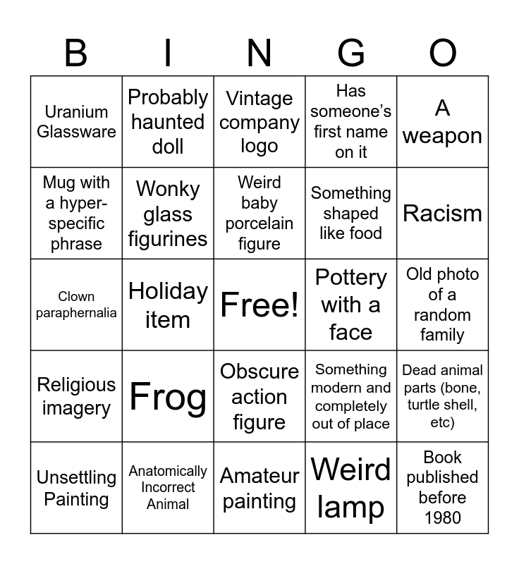 This bingo card has a free space and 24 words: Frog, Anatomically Incorrect Animal, Weird baby porcelain figure, Unsettling Painting, A weapon, Uranium Glassware, Mug with a hyper-specific phrase, Probably haunted doll, Pottery with a face, Obscure action figure, Something shaped like food, Clown paraphernalia, Something modern and completely out of place, Dead animal parts (bone, turtle shell, etc), Wonky glass figurines, Weird lamp, Old photo of a random family, Vintage company logo, Racism, Holiday item, Book published before 1980, Religious imagery, Has someone’s first name on it and Amateur painting.