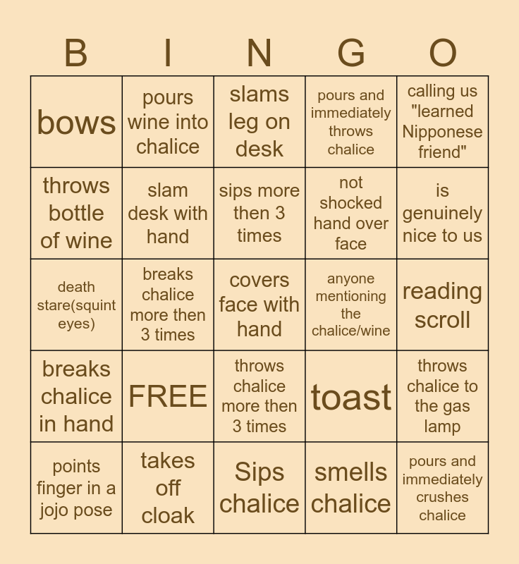 This bingo card has 25 words: breaks chalice in hand, takes off cloak, covers face with hand, smells chalice, calling us "learned Nipponese friend", bows, pours wine into chalice, slams leg on desk, anyone mentioning the chalice/wine, throws chalice to the gas lamp, throws bottle of wine, slam desk with hand, Sips chalice, toast, is genuinely nice to us, points finger in a jojo pose, breaks chalice more then 3 times, sips more then 3 times, not shocked hand over face, reading scroll, death stare(squint eyes), FREE, throws chalice more then 3 times, pours and immediately throws chalice and pours and immediately crushes chalice.