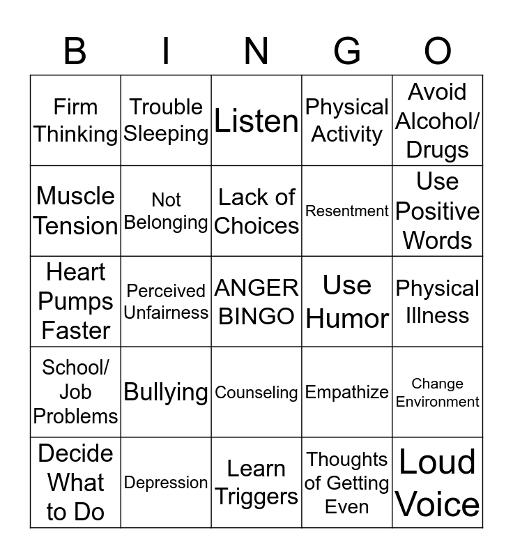 This bingo card has a free space and 24 words: Bullying, Depression, Lack of Choices, Decide What to Do, Avoid Alcohol/ Drugs, Firm Thinking, Muscle Tension, Trouble Sleeping, Use Humor, Counseling, Resentment, Heart Pumps Faster, Empathize, Change Environment, Not Belonging, Thoughts of Getting Even, Physical Illness, Listen, Use Positive Words, Perceived Unfairness, Loud Voice, School/ Job Problems, Physical Activity and Learn Triggers.