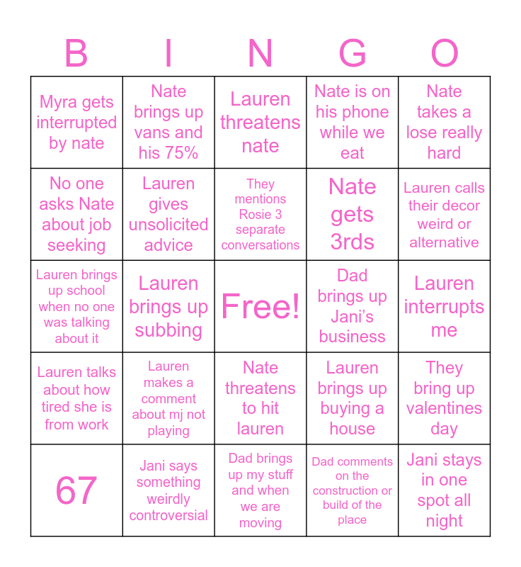 This bingo card has a free space and 24 words: 67, Lauren makes a comment about mj not playing, They mentions Rosie 3 separate conversations, Dad comments on the construction or build of the place, Nate takes a lose really hard, Myra gets interrupted by nate, Nate brings up vans and his 75%, Lauren threatens nate, Dad brings up Jani’s business, Lauren interrupts me, Lauren brings up school when no one was talking about it, Lauren gives unsolicited advice, Lauren brings up buying a house, They bring up valentines day, No one asks Nate about job seeking, Jani says something weirdly controversial, Dad brings up my stuff and when we are moving, Nate is on his phone while we eat, Lauren calls their decor weird or alternative, Lauren talks about how tired she is from work, Lauren brings up subbing, Nate threatens to hit lauren, Nate gets 3rds and Jani stays in one spot all night.
