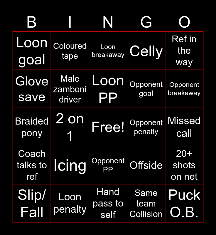 This bingo card has a free space and 24 words: Icing, Loon penalty, Loon PP, Slip/ Fall, Ref in the way, Loon goal, Glove save, Coloured tape, Opponent penalty, Opponent PP, Opponent goal, Braided pony, Offside, 20+ shots on net, Male zamboni driver, Same team Collision, Missed call, Loon breakaway, Opponent breakaway, 2 on 1, Puck O.B., Coach talks to ref, Celly and Hand pass to self.