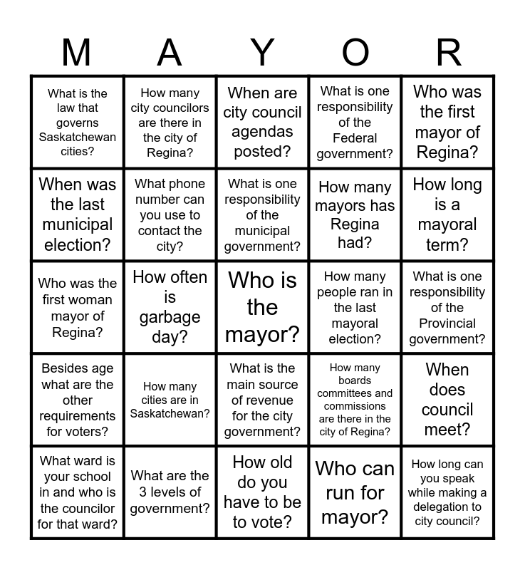 This bingo card has a free space and 24 words: What ward is your school in and who is the councilor for that ward?, How many cities are in Saskatchewan?, What is one responsibility of the municipal government?, Who can run for mayor?, Who was the first mayor of Regina?, What is the law that governs Saskatchewan cities?, How many city councilors are there in the city of Regina?, When are city council agendas posted?, How many people ran in the last mayoral election?, What is one responsibility of the Provincial government?, Who was the first woman mayor of Regina?, What phone number can you use to contact the city?, How many boards committees and commissions are there in the city of Regina?, When does council meet?, When was the last municipal election?, What are the 3 levels of government?, How old do you have to be to vote?, What is one responsibility of the Federal government?, How long is a mayoral term?, Besides age what are the other requirements for voters?, How often is garbage day?, What is the main source of revenue for the city government?, How many mayors has Regina had? and How long can you speak while making a delegation to city council?.