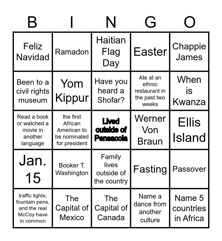This bingo card has a free space and 29 words: traffic lights, fountain pens, and the real McCoy have in common, the second most common language in the US, the first African American to be nominated for president, knows/learning a second language, Feliz Navidad, Haitian Flag Day, Yom Kippur, Booker T. Washington, Werner Von Braun, The Capital of Mexico, Ellis Island, Name 5 countries in Africa, The Capital of Canada, Name a dance from another culture, When is Kwanza, Jose Marti, Family lives outside of the country, Jan. 15, Chappie James, Read a book or watched a movie in another language, Fasting, You have music in your playlist that isn't in Englsih, Ate at an ethnic restaurant in the past two weeks, Been to a civil rights museum, Easter, Ramadon, Passover, Have you heard a Shofar? and Have you ever greeted a person other than shaking their hand?.
