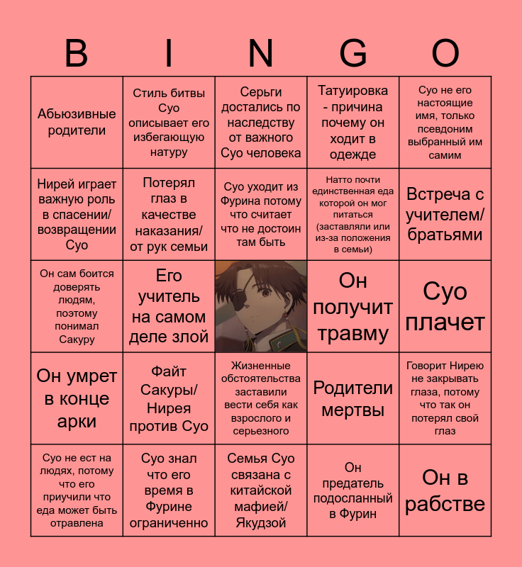 This bingo card has a free space and 24 words: Файт Сакуры/Нирея против Суо, Суо знал что его время в Фурине ограниченно, Суо уходит из Фурина потому что считает что не достоин там быть, Суо не ест на людях, потому что его приучили что еда может быть отравлена, Суо не его настоящие имя, только псевдоним выбранный им самим, Абьюзивные родители, Нирей играет важную роль в спасении/возвращении Суо, Стиль битвы Суо описывает его избегающую натуру, Он получит травму, Жизненные обстоятельства заставили вести себя как взрослого и серьезного, Натто почти единственная еда которой он мог питаться (заставляли или из-за положения в семьи), Он сам боится доверять людям, поэтому понимал Сакуру, Родители мертвы, Говорит Нирею не закрывать глаза, потому что так он потерял свой глаз, Потерял глаз в качестве наказания/от рук семьи, Он предатель подосланный в Фурин, Суо плачет, Серьги достались по наследству от важного Суо человека, Встреча с учителем/братьями, Его учитель на самом деле злой, Он в рабстве, Он умрет в конце арки, Татуировка - причина почему он ходит в одежде and Семья Суо связана с китайской мафией/Якудзой.