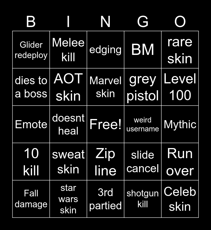 This bingo card has a free space and 24 words: sweat skin, star wars skin, Marvel skin, Fall damage, rare skin, Glider redeploy, dies to a boss, Melee kill, weird username, Zip line, grey pistol, Emote, slide cancel, Run over, AOT skin, shotgun kill, Mythic, edging, Level 100, doesnt heal, Celeb skin, 10 kill, BM and 3rd partied.