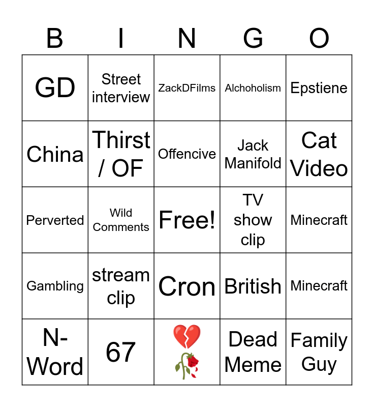 This bingo card has a free space and 24 words: stream clip, 67, Offencive, N-Word, Epstiene, GD, China, Street interview, TV show clip, Cron, Jack Manifold, Perverted, British, Minecraft, Thirst / OF, Dead Meme, Minecraft, ZackDFilms, Cat Video, Wild Comments, Family Guy, Gambling, Alchoholism and 💔🥀.