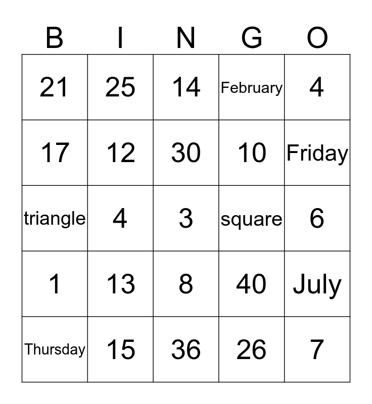 This bingo card has a free space and 24 words: 13, 15, 30, Thursday, 4, 21, 17, 25, square, 8, 10, triangle, 40, July, 12, 26, 6, 14, Friday, 4, 7, 1, February and 36.