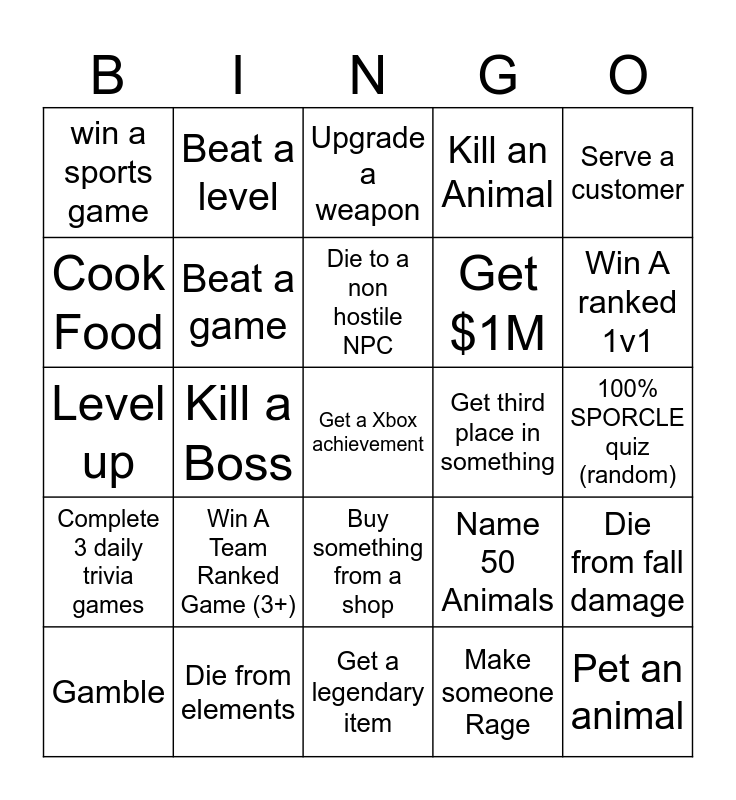This bingo card has 25 words: Win A Team Ranked Game (3+), Get a legendary item, Die to a non hostile NPC, Gamble, Serve a customer, win a sports game, Cook Food, Beat a level, Get third place in something, Buy something from a shop, Get $1M, Level up, Name 50 Animals, Die from fall damage, Beat a game, Pet an animal, 100% SPORCLE quiz (random), Upgrade a weapon, Win A ranked 1v1, Kill a Boss, Get a Xbox achievement, Die from elements, Complete 3 daily trivia games, Kill an Animal and Make someone Rage.