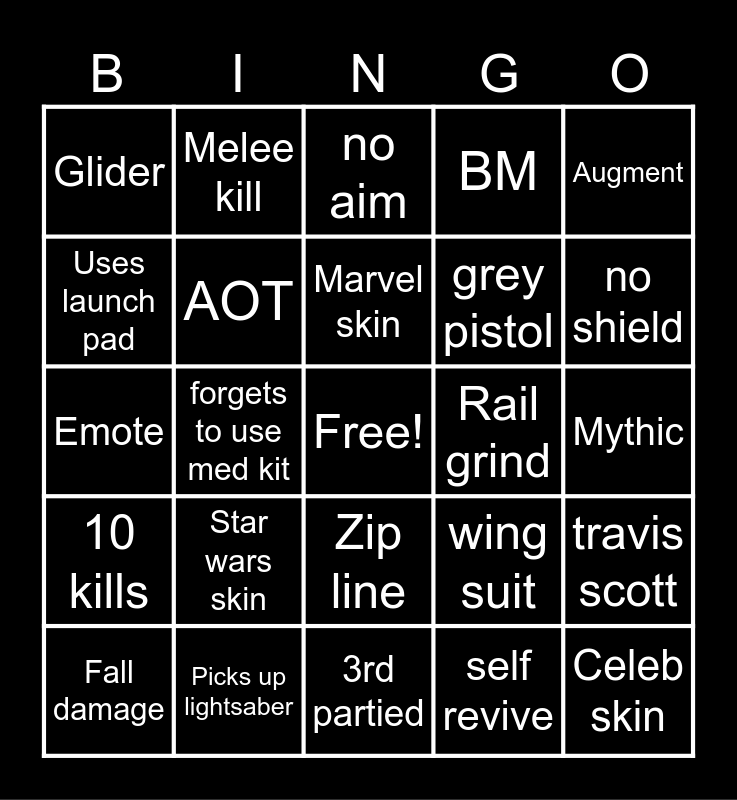 This bingo card has a free space and 24 words: Star wars skin, Picks up lightsaber, Marvel skin, Fall damage, Augment, Glider, Uses launch pad, Melee kill, Rail grind, Zip line, grey pistol, Emote, wing suit, travis scott, AOT, self revive, Mythic, no aim, no shield, forgets to use med kit, Celeb skin, 10 kills, BM and 3rd partied.