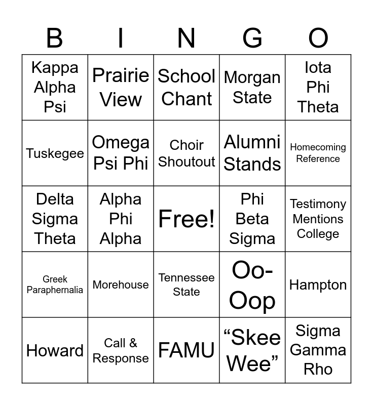 This bingo card has a free space and 29 words: Howard, Pastor says “HBCU”, Alpha Phi Alpha, Spelman, Kappa Alpha Psi, School Chant, Omega Psi Phi, Morehouse, Phi Beta Sigma, Call & Response, Testimony Mentions College, Sigma Gamma Rho, FAMU, “Skee Wee”, Homecoming Reference, Alpha Kappa Alpha, Tennessee State, Greek Paraphernalia, Iota Phi Theta, Delta Sigma Theta, Oo-Oop, Jackson State, Alumni Stands, Tuskegee, Morgan State, Prairie View, Hampton, Choir Shoutout and Call & Response.