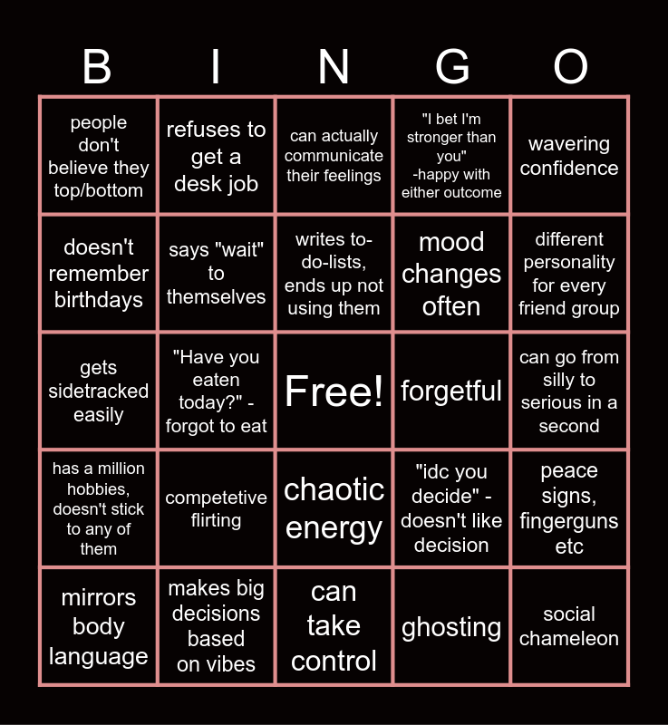 This bingo card has a free space and 24 words: competetive flirting, makes big decisions based on vibes, writes to-do-lists, ends up not using them, mirrors body language, wavering confidence, people don't believe they top/bottom, doesn't remember birthdays, refuses to get a desk job, forgetful, chaotic energy, mood changes often, gets sidetracked easily, "idc you decide" - doesn't like decision, peace signs, fingerguns etc, says "wait" to themselves, ghosting, can go from silly to serious in a second, can actually communicate their feelings, different personality for every friend group, "Have you eaten today?" - forgot to eat, social chameleon, has a million hobbies, doesn't stick to any of them, "I bet I'm stronger than you" -happy with either outcome and can take control.