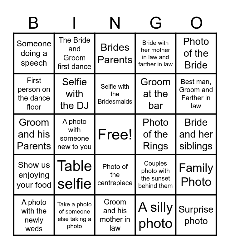 This bingo card has a free space and 24 words: A photo with the newly weds, Table selfie, Selfie with the Bridesmaids, A silly photo, Photo of the Bride, Someone doing a speech, The Bride and Groom first dance, Brides Parents, Photo of the Rings, Bride and her siblings, Groom and his Parents, Selfie with the DJ, Couples photo with the sunset behind them, Family Photo, First person on the dance floor, Take a photo of someone else taking a photo, Groom and his mother in law, Bride with her mother in law and farther in law, Best man, Groom and Farther in law, Show us enjoying your food, A photo with someone new to you, Photo of the centrepiece, Groom at the bar and Surprise photo.