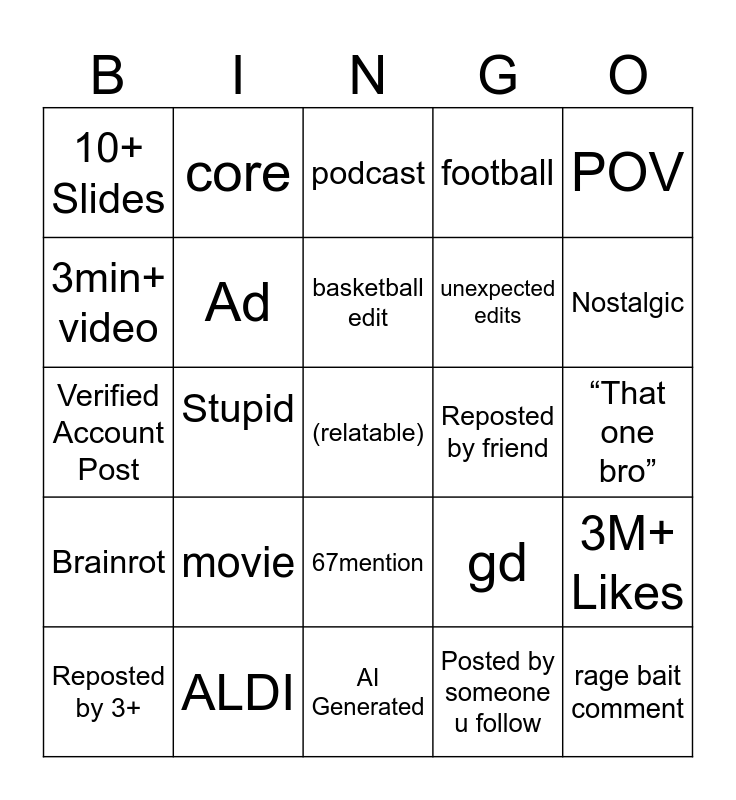 This bingo card has a free space and 24 words: movie, ALDI, basketball edit, Reposted by 3+, POV, 10+ Slides, 3min+ video, core, Reposted by friend, 67mention, unexpected edits, Verified Account Post, gd, 3M+ Likes, Ad, Posted by someone u follow, “That one bro”, podcast, Nostalgic, Stupid, rage bait comment, Brainrot, football and AI Generated.
