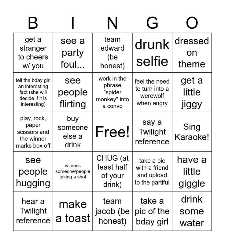 This bingo card has a free space and 29 words: hear a Twilight reference, Take a pic w/ the bday girl, buy someone else a drink, try a new drink, get a stranger to cheers w/ you, team edward (be honest), see people flirting, witness someone/people taking a shot, say a Twilight reference, make a toast, Sing Karaoke!, drink some water, team jacob (be honest), take a pic of the bday girl, get a little jiggy, get someone to chug (at least 4 gulps), CHUG (at least half of your drink), see people hugging, dressed on theme, play, rock, paper scissors and the winner marks box off, take a pic with a friend and upload to the partiful, feel a deep urge to drink blood, feel the need to turn into a werewolf when angry, tell the bday girl an interesting fact (she will decide if it is interesting), drunk selfie, see a party foul..., have a little giggle, work in the phrase "spider monkey" into a convo and go to at least 2 bars!.