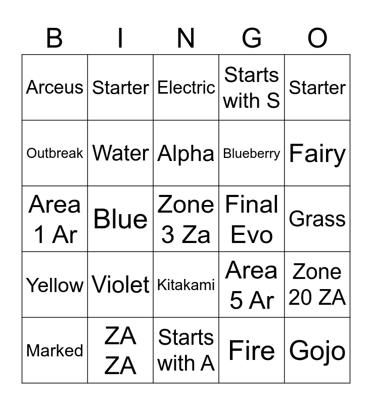 This bingo card has a free space and 24 words: Violet, ZA ZA, Alpha, Marked, Starter, Arceus, Outbreak, Starter, Final Evo, Kitakami, Blueberry, Area 1 Ar, Area 5 Ar, Zone 20 ZA, Water, Fire, Grass, Electric, Fairy, Blue, Gojo, Yellow, Starts with S and Starts with A.