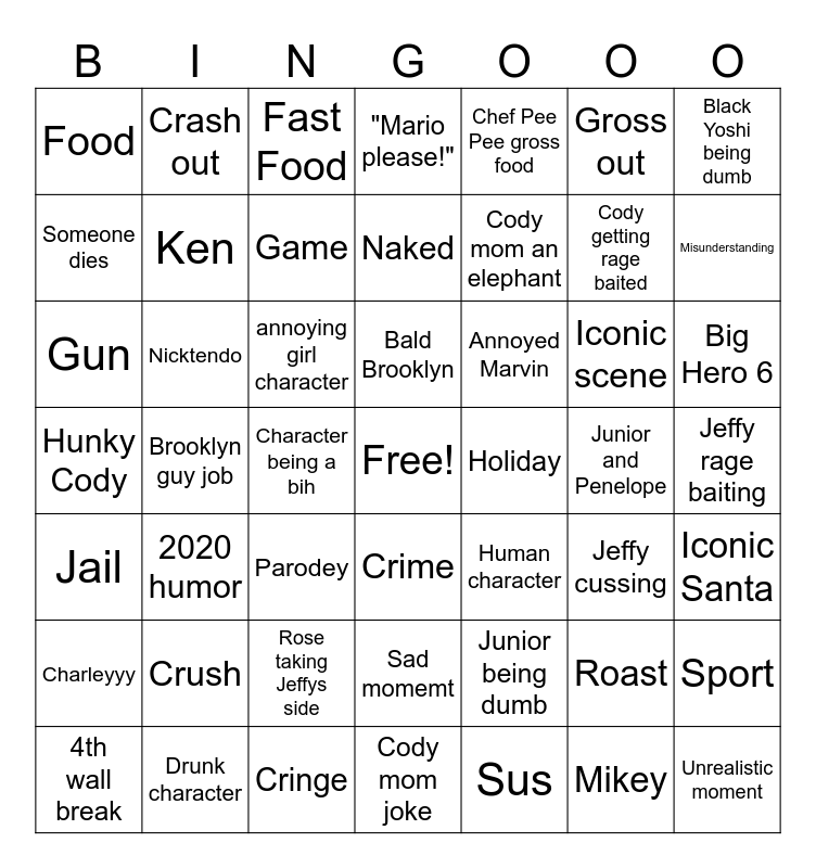 This bingo card has a free space and 48 words: Junior being dumb, Cody getting rage baited, Cody mom joke, Brooklyn guy job, annoying girl character, Jeffy rage baiting, Crash out, Drunk character, Gross out, Crime, Black Yoshi being dumb, "Mario please!", Iconic scene, Annoyed Marvin, Charleyyy, Junior and Penelope, Someone dies, Misunderstanding, Roast, Chef Pee Pee gross food, Cody mom an elephant, Character being a bih, Food, Ken, Sport, Game, Big Hero 6, 4th wall break, Bald Brooklyn, Nicktendo, Mikey, Holiday, Iconic Santa, Crush, Hunky Cody, Human character, Jeffy cussing, Gun, Parodey, Rose taking Jeffys side, Jail, Unrealistic moment, Fast Food, Cringe, Naked, Sad momemt, 2020 humor and Sus.