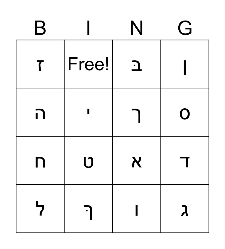 This bingo card has 19 words: א, ב, בּ, ג, ד, ה, ו, ז, Free!, ח, ט, י, ך, ךּ, ל, ם, ן, ס and ע.