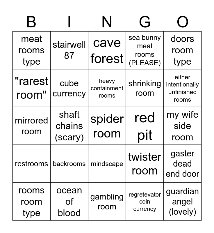 This bingo card has a free space and 24 words: backrooms, ocean of blood, heavy containment rooms, rooms room type, doors room type, meat rooms type, "rarest room", stairwell 87, red pit, mindscape, shrinking room, mirrored room, twister room, gaster dead end door, cube currency, regretevator coin currency, my wife side room, cave forest, either intentionally unfinished rooms, shaft chains (scary), guardian angel (lovely), restrooms, sea bunny meat rooms (PLEASE) and gambling room.